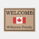 This custom door mat or outdoor welcome rug features an image of the flag of Canada in the center over a beige colored background. The greeting "WELCOME" is printed above the image of the flag with a sample family name printed near the bottom. The letter "h" is subtly placed after the welcome messages as an added Canadian touch, or a reference to the "eh" that Canadians are know for. The Canadian flag features beautiful and bold red and white colors with a red maple leaf in the center.
