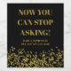 A funny, unique way to announce a baby is on the way as well as telling people to stop asking! With a black background, the modern gold typography reads "Now you can stop asking!" and underneath, in simple modern gold typography you can add your family name and due date. At the bottom of the label is a sprinkling of faux gold confetti.