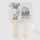 The two cute little black and white pugs on this hand fan are original colour pencil drawings. on one side of the fan the little pug is waving hello and on the other side of the fan the other cute pug is showing his curly tail whilst puppy bowing. The fun pug slogans with the illustrations are customisable for you to change to your own text if you wish to. keep cool with this cute hand fan and at the same time bring a smile to peoples faces with the cute pug characters.