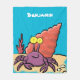This happy hermit crab cartoon is a bright and colourful purple and orange with a blue background. Take me to the sea!