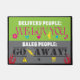 Funny doormat has two messages: Delivery People We Love You with hearts and flowers, and Sales People Go Away with scary warning icons.
