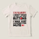 This lighthearted novelty t-shirt is the perfect way to poke fun at those moments when you accidentally say the wrong thing and seem to have pushed someone's buttons. The humourous slogan "I'm sorry I didn't mean to push all your buttons. I was looking for mute" is sure to get a laugh and spark a conversation. Whether you're wearing it to a party, out shopping, or just running errands, this t-shirt is a guaranteed way to add a touch of humour to your day.