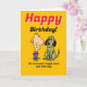 This funny birthday greeting card was designed with a woman who has recently been in a divorce or a break, up in mind. The outside features colourful drawings of a man and a dog, by which the sender promises the birthday woman a "dog" if the now-single recipient is nice. The inside surprisingly identifies the "dog" as a man, with whom the recipient might associate with her ex-husband, or ex-boyfriend. The humourous expression on the card capitalises on the familiar tendency of women to refer to men who are unfaithful, womanising, or just plain messy in romantic relationships as "dogs."