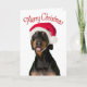 Doberman Pinscher dog wearing Santa hat , with tongue stuck out. Vertical Photo Christmas card. White background. "Ho-Ho-Ho!" inside Christmas message in green type. Message can be personalised. Sure to please the Doberman fan (or any dog-lover) on your list.