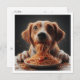 A funny custom dinner invitation featuring a dog eating spagetti very messily, a great card for all dog lovers.