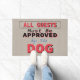 Family and friends will get a chuckle when they read this funny and humourous door mat. Modern Welcome guests with a clear message: All Guests Must Be Approved By The Dog. Modern black, red, white and blue typography style fun quote. Brown textured looking background.