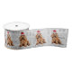 An adorable watercolor illustration of a Cocker Spaniel dog with a fun 'woof' word art background in a soft, pale grey. The dog wears a red hat, making it perfect for pet lovers.