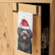 Here's a fun holiday kitchen towel or year-around hand towel. An adorable watercolor illustration of a Barbet black dog who sits with a fun 'woof' word art background. The dog wears a Santa hat.