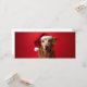 Portrait of a fun dog with a Christmas cap on a red background. He has raised ears and looks like a labrador