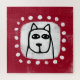 A cute drawn dog in black and white over a red textured background surrounded with white dots.