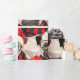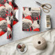 An adorably fashionable Pug in eyeglasses, Santa cap and striped matching winter scarf is patterned on this fun holiday gift wrap paper for pet lovers.