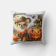 Colourful artistic pillow featuring a funny dog dressed up for Halloween, surrounded by pumpkins. In the background a haunted castle with wicked witch and bats. So where are those treats they promised?