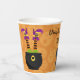"DRINK UP WITCHES" say these cute Halloween party paper cups. On one side of the text is a pair of striped stocking legs with black and lime green boots. On the other side is another pair of witch legs with purple boots upside down in a black cauldron. The image and text are placed on a pale orange jack o lantern pattern background. *Thanks to Huckleberry Hearts for the clip art used in this design.