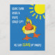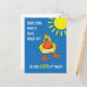 Funny duck riddle for kids postcard. "What time does a duck wake up? At the Quack of dawn!" Cartoon illustrations on a blue background.