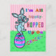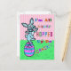 The Easter bunny is all excited, hopping in the air and shouting for joy because its favourite holiday has arrived. It's so enthusiastic, it hops up on a dyed Easter egg and declares, "I'm all hippity-hopped up on...." But before it can say something innocent like "Easter spirit," the egg goes "crack!" / This humourous, silly, slightly twisted postcard is for fans of funny wordplay.