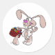 This image shows a cartoon bunny with long ears, a pink nose, and big teeth carrying a basket full of colourful Easter eggs. The playful design makes it a fun and festive sticker for Easter celebrations.