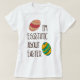 "I'm eggstatic about Easter" humourous quote women's t-shirt for Easter with colourful painted eggs.