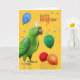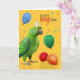 This Eclectus parrot in bright and vivid green wears a party hat and stands with balloons and falling confetti to send birthday wishes to a pet lover.