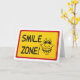 It's hard not to smile at this card and feel a connection to the person who sent it. Smile zone is in a handwritten font with a joyous grinning face alongside it. Colours include yellow, red, white, and black. Digital image of hand-painted paper. Inside: Blank for your greeting.