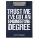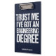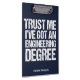 Trust Me I've Got an Engineering Degree. A graduation humour clipboard gift for a funny engineer after they graduate college or university. Customise with your company name or other text.