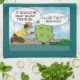 This funny geocaching design has a cartoon with a geocacher reaching and saying, "It should be behind this bush. I'll be the FTF. Woo-hoo!"