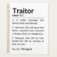 A humourous definition of "Traitor" is presented as a dictionary entry with a sarcastic tone, suggesting the term refers to a valued coworker who is leaving for a new job. It playfully labels the departing employee as a traitor for leaving friends behind but also acknowledges their potential for greatness in their next role.
