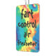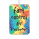 Funny car air freshener with the words "fart control" and retro tie dye background image that is colourful and fun. Designed as a humourous way to make everyone in your car smile in a design that has a throw back look and feel displayed on both sides.
