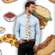 A funny necktie featuring a fast food pattern with hamburgers, hot dogs, pizza and dipping sauces.