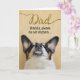 This is a funny Father's Day card design featuring a colour, close up, photographic image of a dog lying on his back, ears up, eyes closed and sporting a really silly grin. At the top is the text 'Dad' in a beautifully relaxed, hand written effect font and with a digitally created gold sparkle effect.