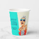 An outrageously funny and unique birthday paper cup for a fabulous woman celebrating her 50th Birthday, this design features a kitschy stylish woman in striped sunglasses and hair turban with a polka dot bag and striped towel, rocking her attitude. The humour is carried out in the bold text title "Forty IS THE NEW F-BOMB". Personalise the name with the fabulous Birthday Girl. The retro colour scheme of aqua, beige, navy and red adds to the fun of this design.