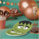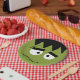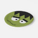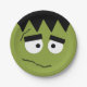 A funny Halloween Frankenstein face on a paper plate. There are stitches on the left eye and the mouth is also stitched. The eyes are funny and cross eyed.