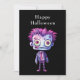 Happy Halloween card with a cute illustration. Frankenstein monster with pink and purple hair and a dapper suit and tie.