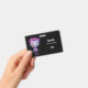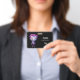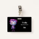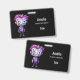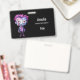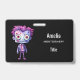 Name badge with a cute illustration. Frankenstein monster with pink and purple hair and a dapper coat and tie.