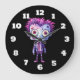 A clock with a cute illustration. Frankenstein monster with pink and purple hair and a dapper suit and tie.