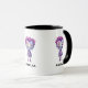 A mug with a cute illustration. Frankenstein monster with pink and purple hair and a dapper suit and tie.