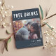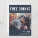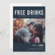 Funny wedding save the date cards in a modern navy blue colour with white text design with your custom photo design that read "Free drinks (and we're getting married)". Customise the front of the card with your horizontal photo (crop to rectangle before uploading for best results). Add your names, wedding date and location. Customise the backside of card with your wedding details.