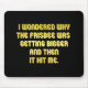 Bold yellow text on a black background presents a humourous pun about a frisbee getting bigger and then hitting someone. The simple design emphasizes the joke's punchline effectively.
