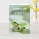 Greeting card of a green tree frog, sitting on leaves with the text: 'What's up, Frog?', an analogy to Bugs Bunny saying 'What's up, Doc?' You can send this to a friend.
