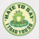 Add a splash of humour to your day with this hilarious frog pun design! Featuring a cute frog illustration and the witty phrase “I Hate To Say I Toad You So,” this design is perfect for frog lovers, pun enthusiasts, and anyone who enjoys playful wordplay. Great for decorating laptops, water bottles, notebooks, and more.