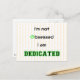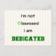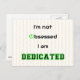 A fun postcard with the text "I'm not obsessed I am dedicated" in black lettering. The O of obsessed is shaped like a computer power button, and the background is a binary repeating pattern of 0's and 1's. For anyone who loves to spend time on their computer.