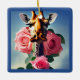 Personalised ceramic Christmas ornament features funny giraffe portrait with big pink roses. Digital painting created with AI generating software. Personalise with name or message on back.