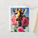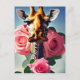 Adorable postcard features funny giraffe portrait with big pink roses. Digital painting created with AI generating software.