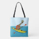 A funny cartoon giraffe paddling a sea kayak on a calm blue sea. I drew this inspired by the funny thought of such a tall animal beast balancing in a little boat.