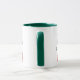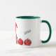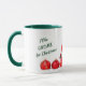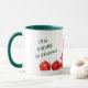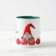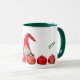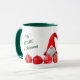 This fun Holiday mug features a cute image of a little white bearded gnome wearing a red Santa hat that comes down over his eyes. He is standing behind a row of gold and silver decorated bright red tree bulbs. The green text currently says "I'll be GNOME for Christmas!" and the date, but you may easily change it to anything you'd like.