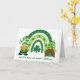 Two funny little gnomes stand at each end of a decorated green Irish rainbow on the front of this St Patrick's Day greeting card. A big green shamrock is at the centre bottom of the rainbow, and each of the gnomes wear shamrock decorated hats. The text at the bottom says "At the end of every rainbow..." The thought is completed on the inside, with the text that says "...is a gnome pretending to be a leprechaun". Sure to bring a smile this season with the trendy gnome craze! All the text, front and inside, may be customised to anything you'd like.