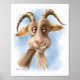 A playful goat caricature with curved horns, droopy eyes, and a crooked, toothy grin. Soft, painterly details and a light blue background give this illustration a humorous, charming personality perfect for animal lovers and farm-themed gifts.