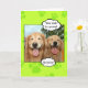 This funny greeting card features a photograph of two laughing golden retriever dogs. Speech bubbles say, "You look so young!" and "Ha ha ha!" while inside text reads, "Happy birthday to a golden oldie!"