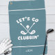 Funny golf club design features "Let's Go Clubbin' " in the centre in white type arranged with two golf clubs and a golf ball all on a solid turquoise background. There are two small white accent stripes above and below the central design. The bottom portion contains a modern template for custom monogram, name or text of choice. Message below this listing or email beachpause@gmail.com with custom colour requests.
