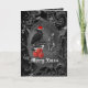 Fun dark fantasy gothic alternative black Christmas card, with funny skeleton and a cute crow bird wearing red Santa hat and presents .
