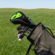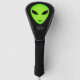 Funny green alien head golf driver sock head cover. Custom golf club protector with extra terrestrial life form. Personalise this cover with your own name initials or text. Cool design for golf lover, player, coach, instructor, caddie, dad, husband, brother, boss, coworker, boyfriend, father etc.